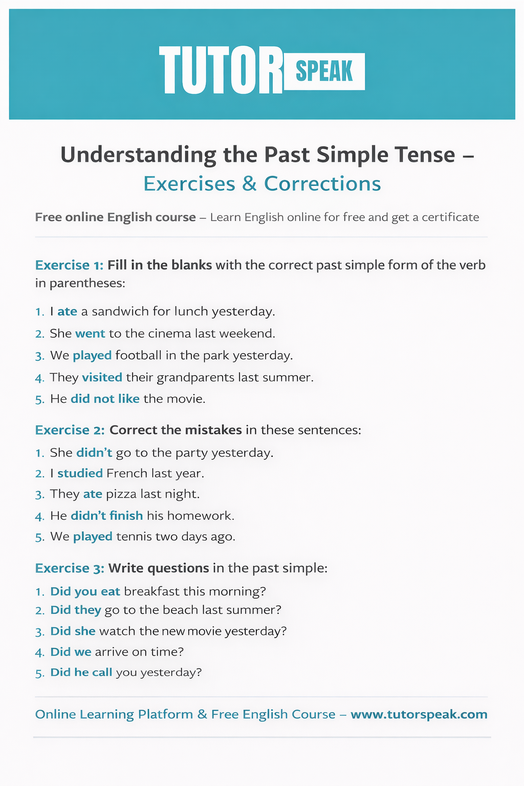 The past simple tense is used to describe actions or situations that happened at a specific time in the past. It’s one of the most common tenses in English and is used for completed actions, habits, or events in the past.